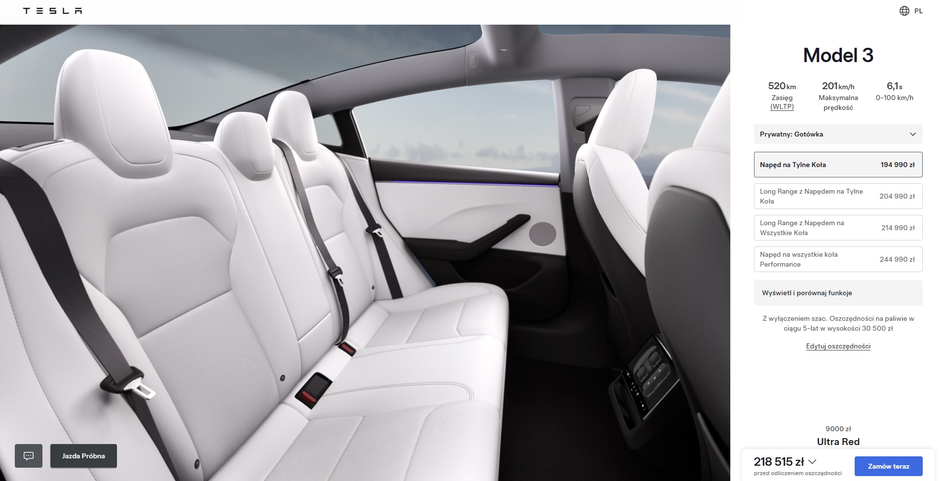 Tesla podniosła ceny Tesli Model 3 Napęd na Tylne Koła, jedynego wariantu w gamie wyposażonego w baterię LFP. Samochód kosztuje teraz 194 990 złotych (+10 000 zł, +5,4 proc.), podczas gdy wcześniej dostępny był za 184 990 złotych. Zmiana ceny może być związana z nadchodzącą premierą Tesli Model 3 Standard, żeby klienci… zauważyli obniżkę, gdy zubożona edycja Standard zawita wreszcie do oferty.