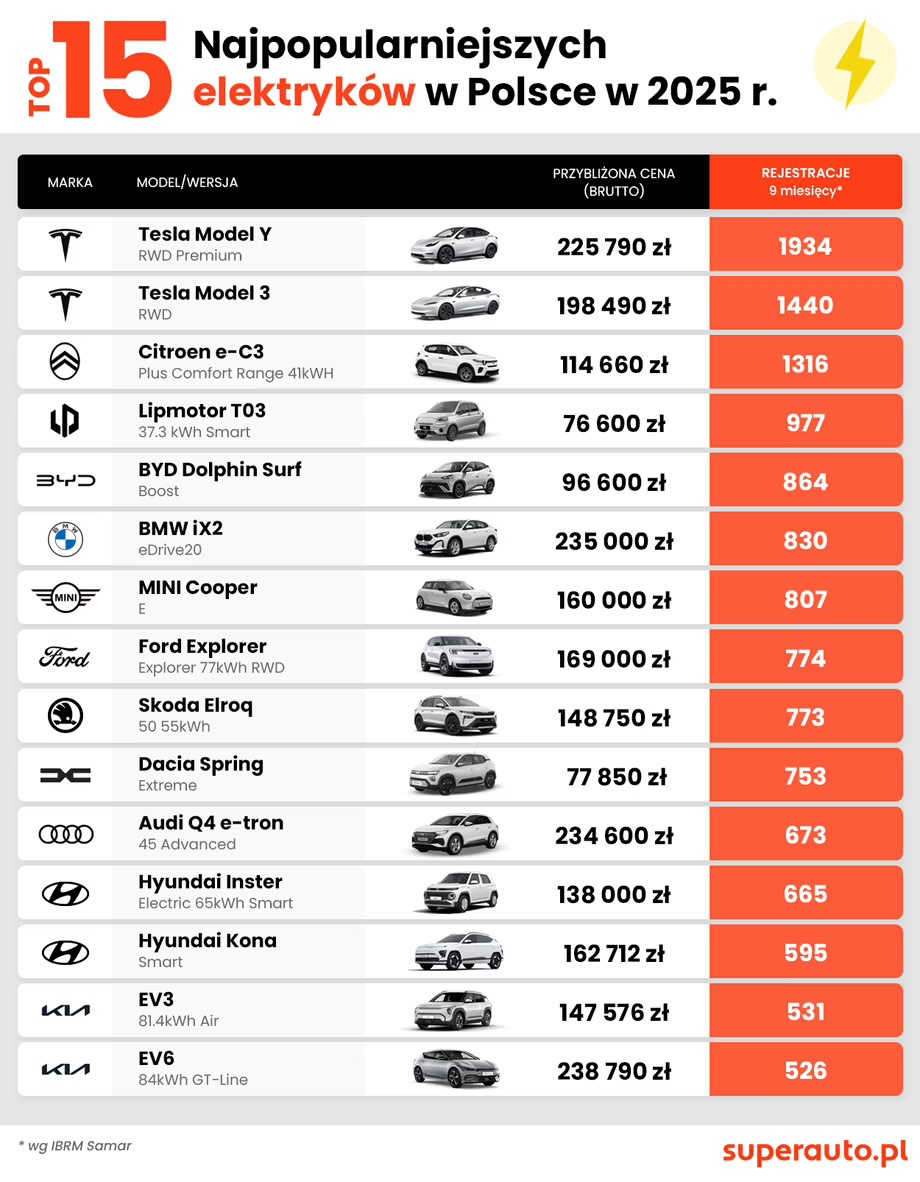 Z danych zebranych przez portal IBRM Samar wynika, że w okresie od stycznia do końca września najchętniej kupowanymi samochodami elektrycznymi były Tesle i… auta najtańsze. Pierwsza piątka to 1/ Tesla Model Y, 2/ Tesla Model 3, 3/ Citroen e-C3, 4/ Leapmotor T03, 5/ BYD Dolphin Surf. Dopiero na szóstym i jedenastym miejscu uplasowały się nie-Tesle, które kosztują mniej więcej tyle, ile Model Y. W całym TOP15 był jeszcze tylko jeden taki samochód, Kia EV6.