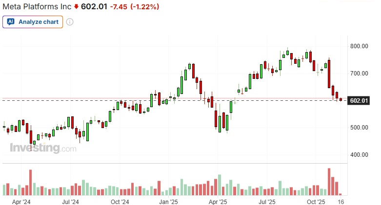 Notowania giełdowe akcji Meta Platforms, źródło: investing.com