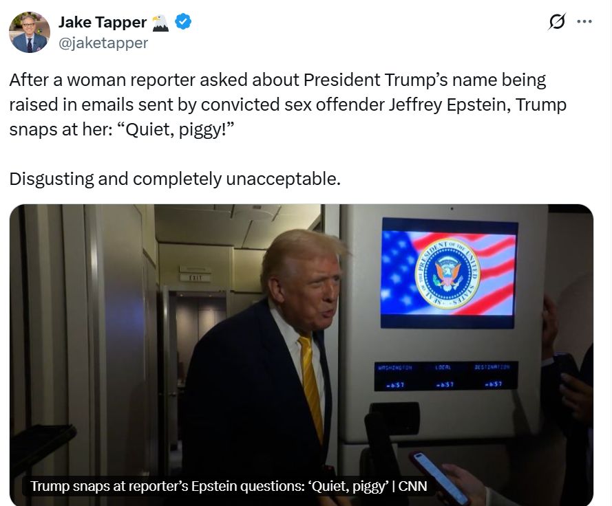 Catherine Lucey, korespondentka Bloomberga z Białego Domu, podczas krókiej konferencji na pokładzie samolotu, chciała zadać pytanie dotyczące rozwijającego się skandalu Jeffreya Epsteina oraz możliwości, że Izba zagłosuje za ujawnieniem wszystkich akt związanych z jego sprawą.