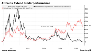Podczas poprzednich „rynków byka” indeks altcoinów rósł szybciej niż główne kryptowaluty. Jednak ten trend odwrócił się w zeszłym roku, gdy amerykańskie władze giełdowe zatwierdziły ETF-y kupujące bitcoina, a potem też ethereum. I to tam zaczął płynąć kapitał. We wrześniu ruszył ETF oparty o kryptowalutę DogeCoin. Nie odnotował jednak ani jednego dnia napływu aktywów, a jego wartość spadła o kilkanaście procent w ciągu pierwszych tygodni po debiucie.