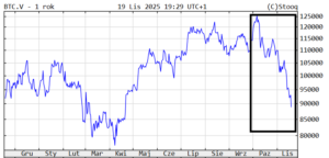 Na początku października bitcoin przebił po raz pierwszy psychologiczną granicę 125 000 dolarów (wcześniej w tym roku kilka razy odbijał się od poziomu 120 000 dolarów) i wydawało się, że skłonność inwestorów do ryzykownego inwestowania spowoduje ciąg dalszy kryptowalutowej hossy. Stało się dokładnie odwrotnie. Od kilku tygodni bitcoin tonie w szybkim tempie. Właśnie spadł wyraźnie poniżej 90 000 dolarów. Jest już niżej niż na początku tego roku.