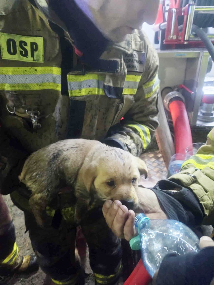 Strażacy uratowali z płomieni przerażonego szczeniaka. To zdjęcie chwyta za serce