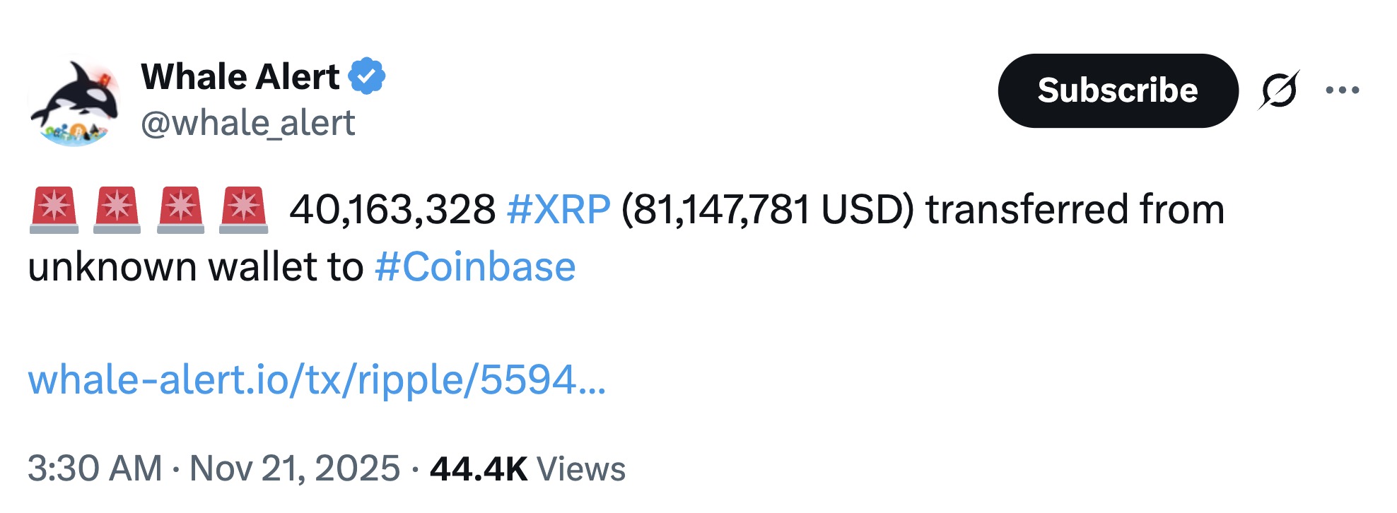 XRP osiąga nierównowagę likwidacyjną na poziomie 3554% w godzinnej krwawej łaźni po transferze 81 147 781 USD do CoinbaseWedług Whale Alert, nieznany portfel przelał 40 163 328 XRP – o wartości 81 147 781 USD – do Coinbase, co natychmiast wywołało niepokój na rynku. Za każdym razem, gdy ponad 40 milionów XRP trafia jednocześnie na dużą giełdę w USA, uczestnicy zazwyczaj zakładają to samo: ktoś szykuje się do zalania rynku dużym zleceniem sprzedaży.