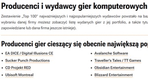 Encyklopedia Gier to nie tylko gry wideo, lecz również katalog firm. Znajdziesz w nim producentów i wydawców wszystkich opisanych przez nas gier. Po kliknięciu w nazwę jednego z nich, zostaniesz przeniesiony do podstrony, na której wylistowane są wszystkie produkcje z jego portfolio, jakie trafiły do Encyklopedii. Ponadto w przypadku najważniejszych podmiotów czekają tam na Ciebie opisy pełne faktów i ciekawostek na temat danej firmy.