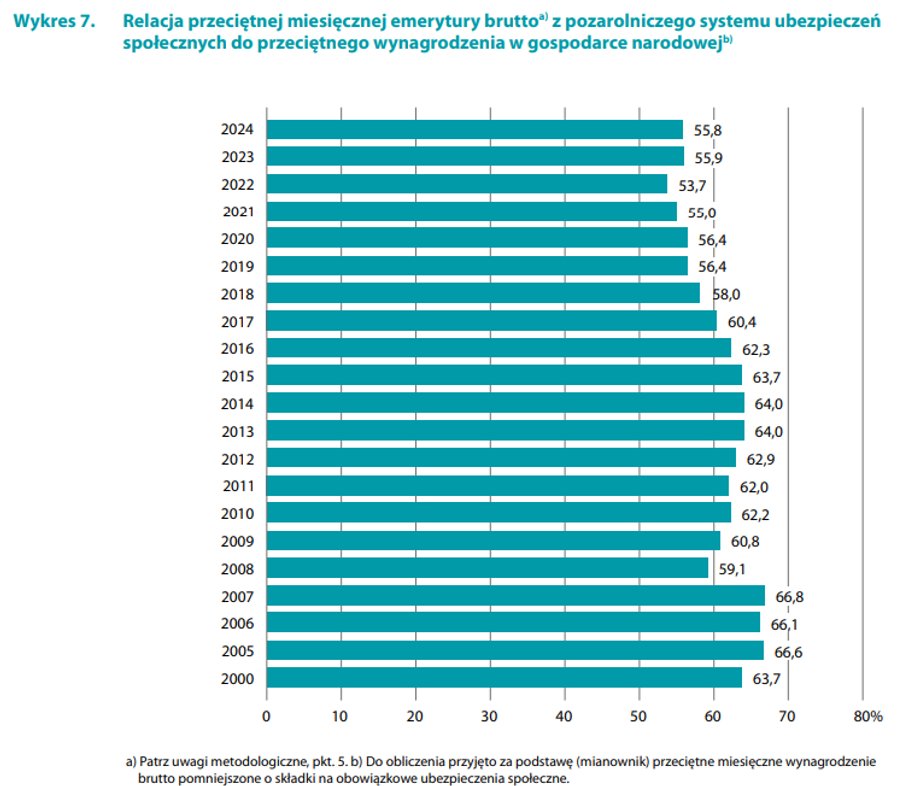 Relacja średniej emerytury z ZUS do przeciętnego wynagrodzenia w 2024 r. wyniosła 55,8 proc. Tym samym zanotowano lekki spadek w porównaniu do 2023 r. W przypadku KRUS relacja ta wyniosła — 29,6 proc., co oznacza niewielki spadek po wcześniejszym wzroście w 2023 r.