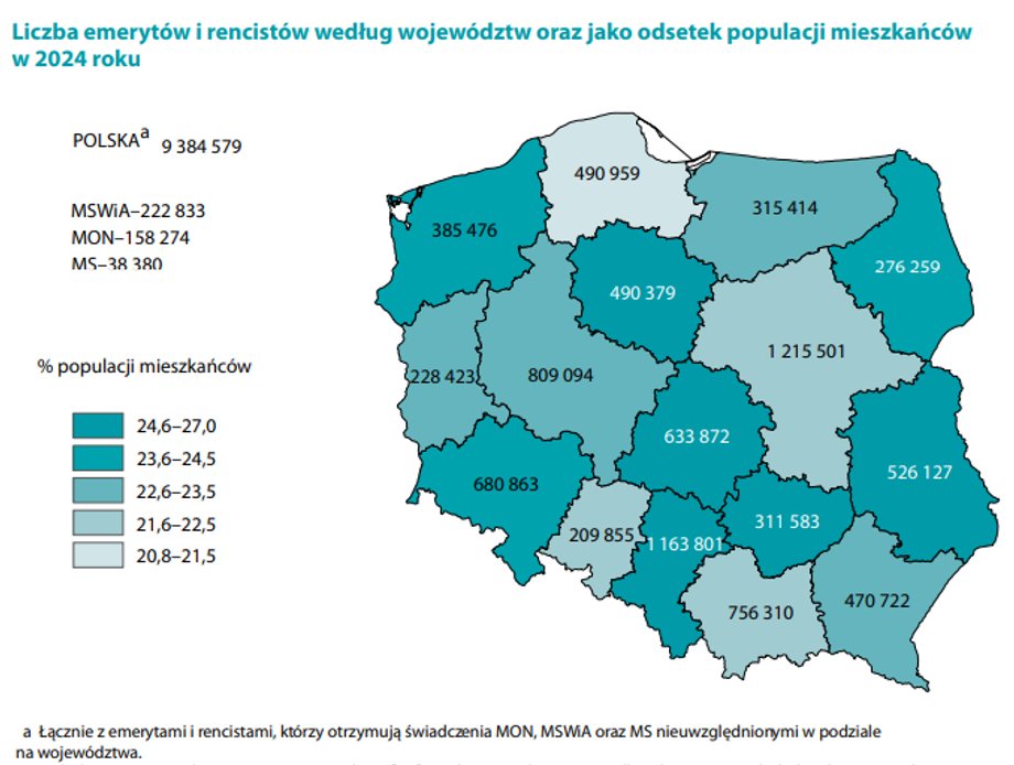 Najwięcej emerytów jest w województwie mazowieckim (ponad 1,21 mln). Granicę 1 mln przekracza jeszcze tylko Śląsk.