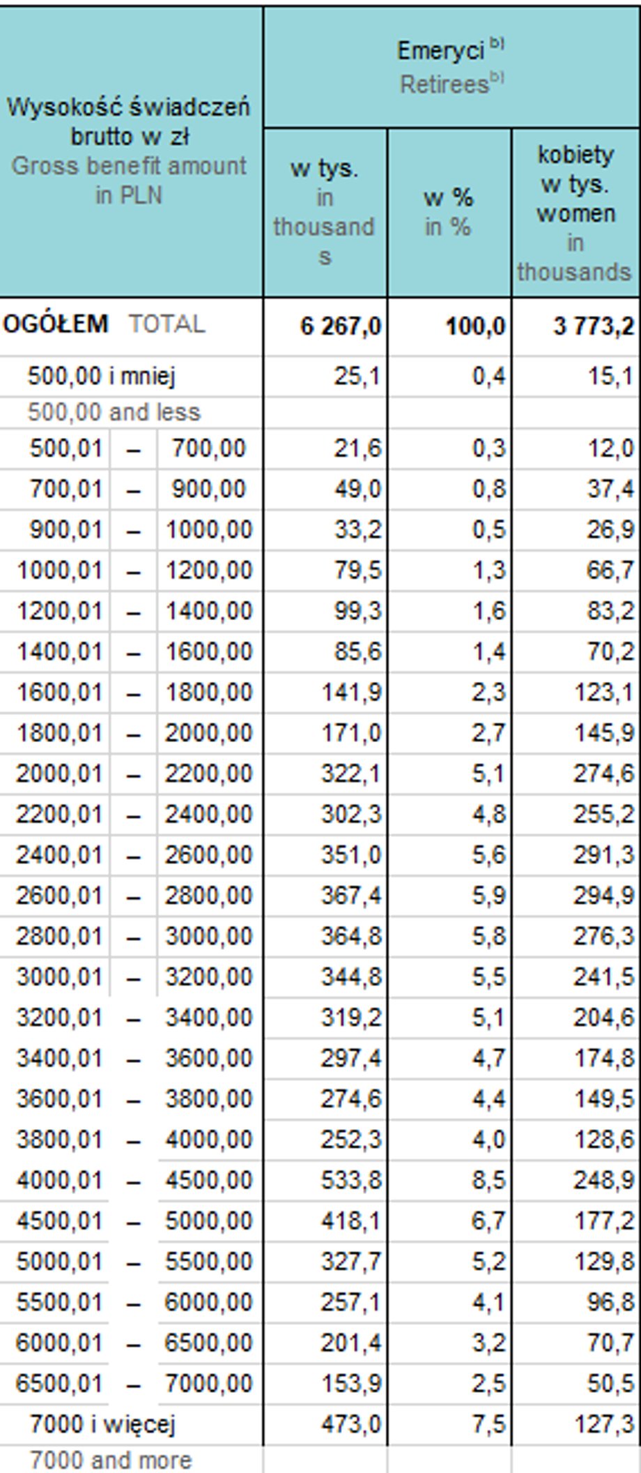 Ze szczegółowych statystyk wynika, że np. 473 tys. emerytów z ZUS w Polsce w 2024 r. miało miesięczną emeryturę przekraczającą 7 tys. zł brutto. Na takie pieniądze mogło liczyć 7 emerytów na 100. Jednocześnie prawie 129 tys. osób nie mogło liczyć na więcej niż 1 tys. zł brutto.