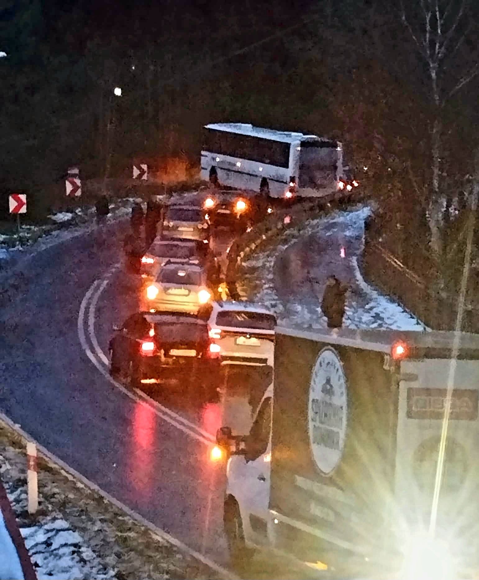 Na miejscu panują bardzo śliskie warunki, a kierowcy poruszają się z minimalną prędkością lub pozostają w miejscu, nie chcąc ryzykować kolejnych kolizji. Służby drogowe oraz kierowcy pojazdów ciężarowych starają się udrożnić przejazd, jednak do czasu usunięcia autokaru droga pozostaje nieprzejezdna.