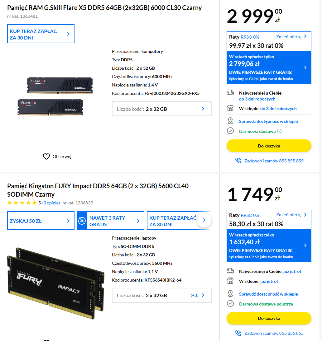 Ceny poszybowały z poziomu około 550 zł (130 dolarów) do abstrakcyjnych 1800-1900 zł (440 dolarów). A to dopiero wierzchołek góry lodowej. Jeśli marzy Wam się solidne 64 GB szybkiej pamięci DDR5, musicie przygotować się na wydatek rzędu 3000, a nawet 3800 złotych (700-900 dolarów). Na szczęście, w polskich sklepach ceny nie osiągają jeszcze aż takich poziomów.