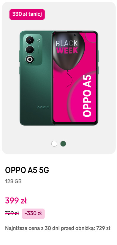 Magentowy operator komórkowy oferował OPPO A5 w pierwotnej cenie 729 złotych. Jest to zarazem najniższa cena w ciągu ostatnich 30 dni. Teraz spada ona z okazji Czarnego Piątku do zaledwie 399 złotych, przyznany rabat wynosi więc -330 zł (-45%).