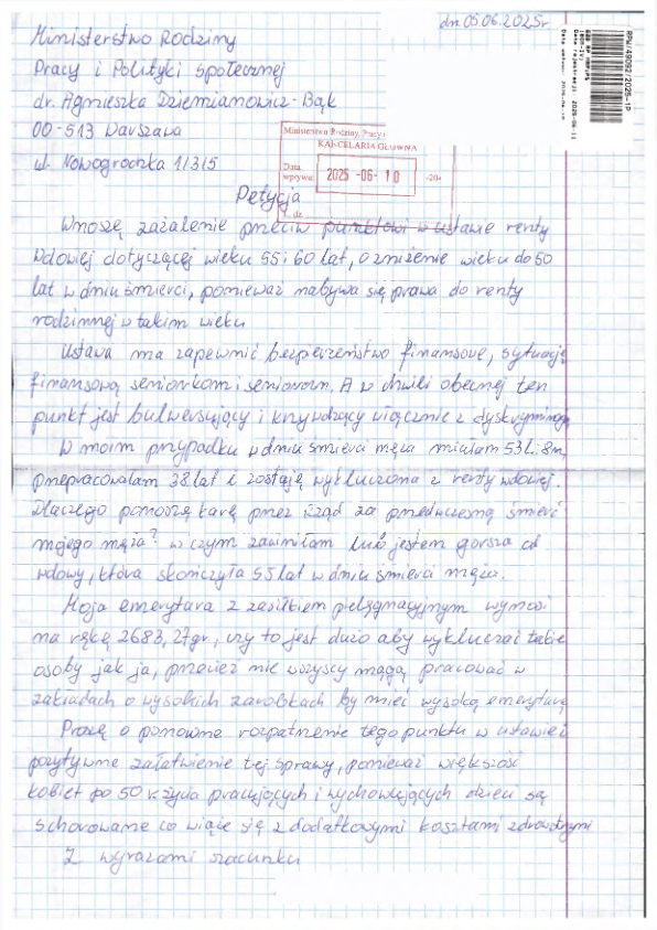 Petycja 77-2025 dotycząca zmian prawnych rozszerzających zasady przyznawania tzw. renty wdowiej dotyczących obniżenia wieku uprawniającego do świadczenia