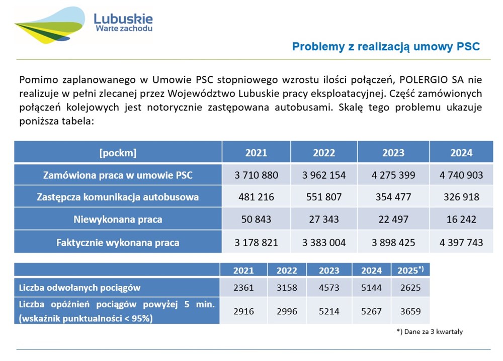 Przed formalnym powołaniem spółki uzasadnienie do jej powołania przedstawił Marszałek województwa lubuskiego, Sebastian Ciemnoczołowski. Samorządowiec mówił na nadzwyczajnej sesji, że od początku 2021 roku Polregio odwołało w województwie ponad 17,5 tysiąca pociągów – dokładniej 17861 połączeń, a dokładne dane w tej kwestii widać na poniższym slajdzie.