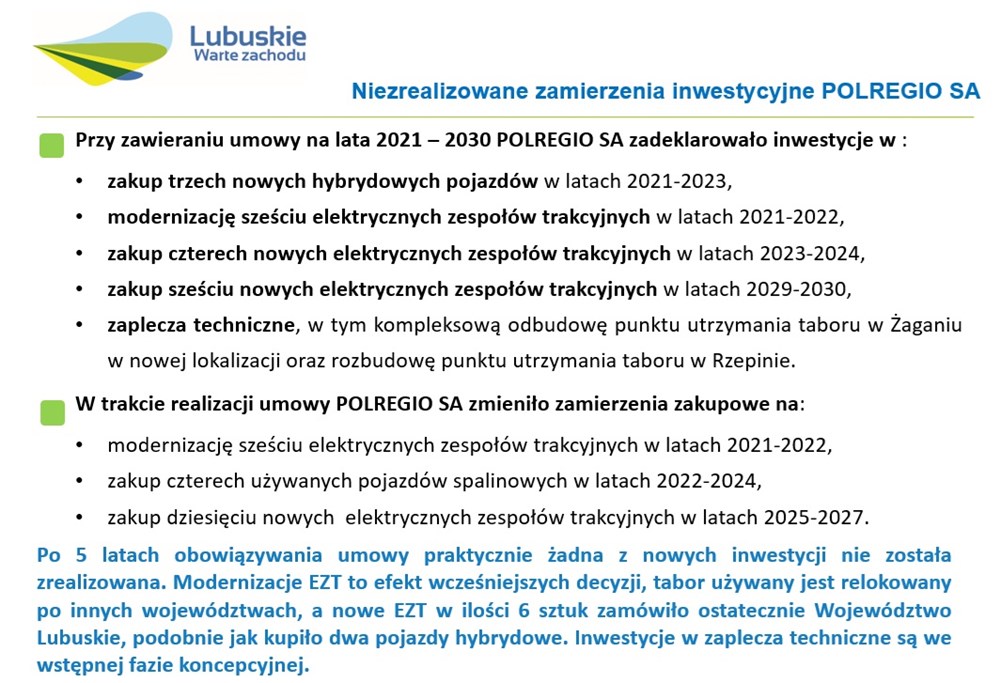 Ciemnoczołowski przypominał także o obowiązkach Polregio, wynikających z obowiązującej umowy w zakresie poszczególnych inwestycji w lubuskim zakładzie spółki – chodzi o zakup nowego taboru oraz budowę bądź rozbudowę zaplecz utrzymaniowych. Jak widać na slajdzie, zostały one dość mocno ograniczone.