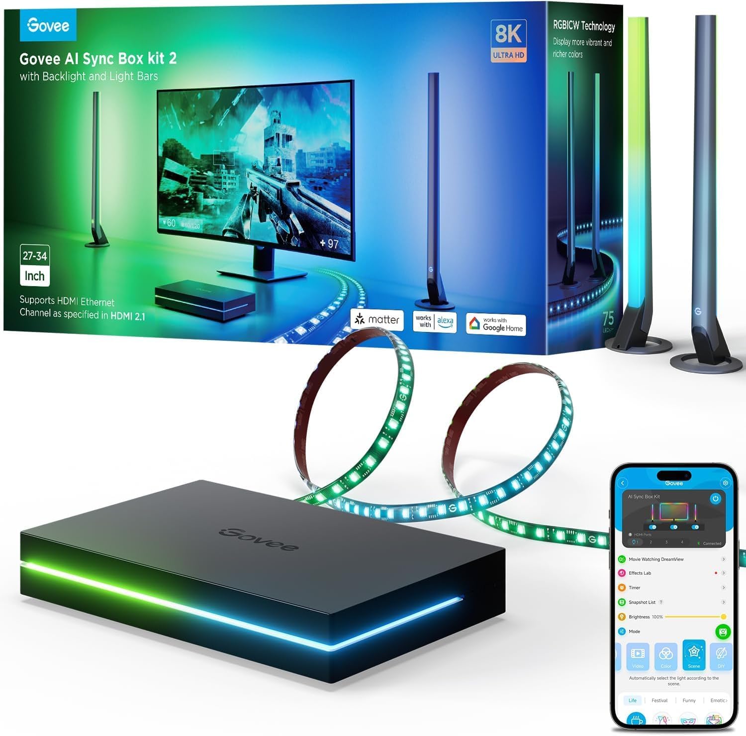 Govee HDMI 2.1 Sync Box Kit 2, z paskiem świetlnym i taśmą LED, obsługuje 8K 60Hz, 4K 144Hz, VRR i ALLM, Dreamview, współpracuje z Matter i Alexa, podświetlenie tła monitora 27-34″: 1132 zł -> 849 zł