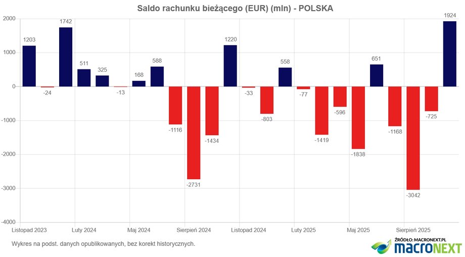 Z opublikowanych 15 grudnia 2025 r. wstępnych danych bilansu płatniczego Polski za październik 2025 r. wynika, że saldo rachunku bieżącego było dodatnie i wyniosło 8,2 mld zł. W analogicznym miesiącu 2024 r. saldo rachunku bieżącego było również dodatnie i wyniosło 4 mld zł.