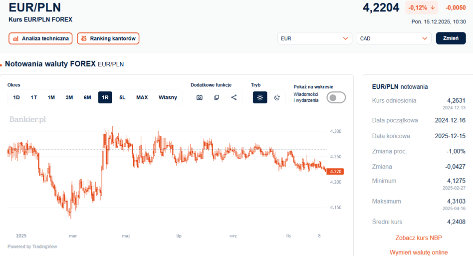 O 10:30 kurs euro wynosił 4,2204 zł i znalazł się najniżej