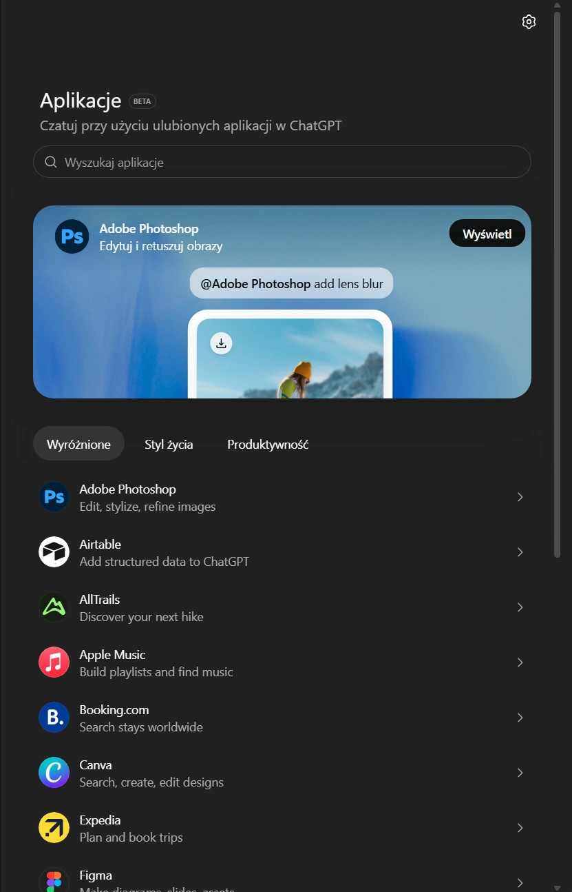 Lista aplikacji w ChatGPT