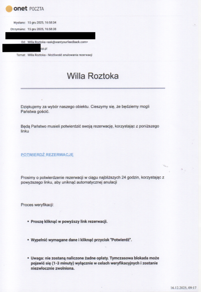 - Uważajcie na wiadomości dotyczące rezerwacji noclegu pochodzące z dziwnych adresów (tj. nie należących do hotelu / obiektu noclegowego)