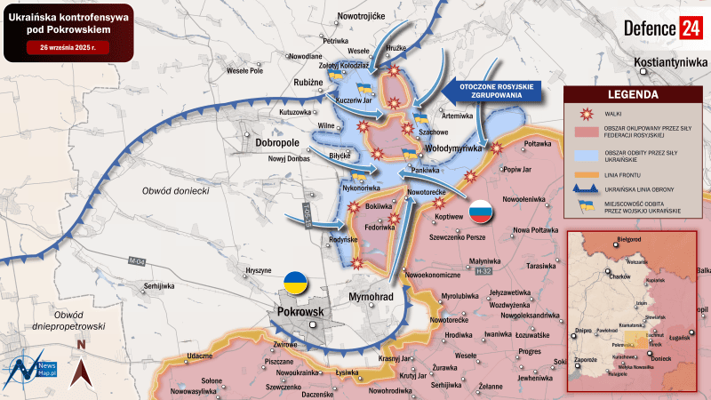 Według RFU News ukraińska kontrofensywa w okolicach Pokrowska doprowadziła do zamknięcia w okrążeniu kolejnego zgrupowania rosyjskich wojsk. Utworzony w ten sposób „kocioł” jest większy niż dwa pozostałe razem wzięte, które powstały w poprzednich działaniach ponad trzy tygodnie temu. Okrążeni tam rosyjscy żołnierze zostali w ten sposób skazani na zagładę, nie mając już żadnych szans na ewakuację lub uzupełnienie zapasów. Ci, którzy mieli im tę pomoc dostarczyć, sami zostali bowiem otoczeni i teraz to do nich w pierwszej kolejności próbują się przebić rosyjskie wojska.