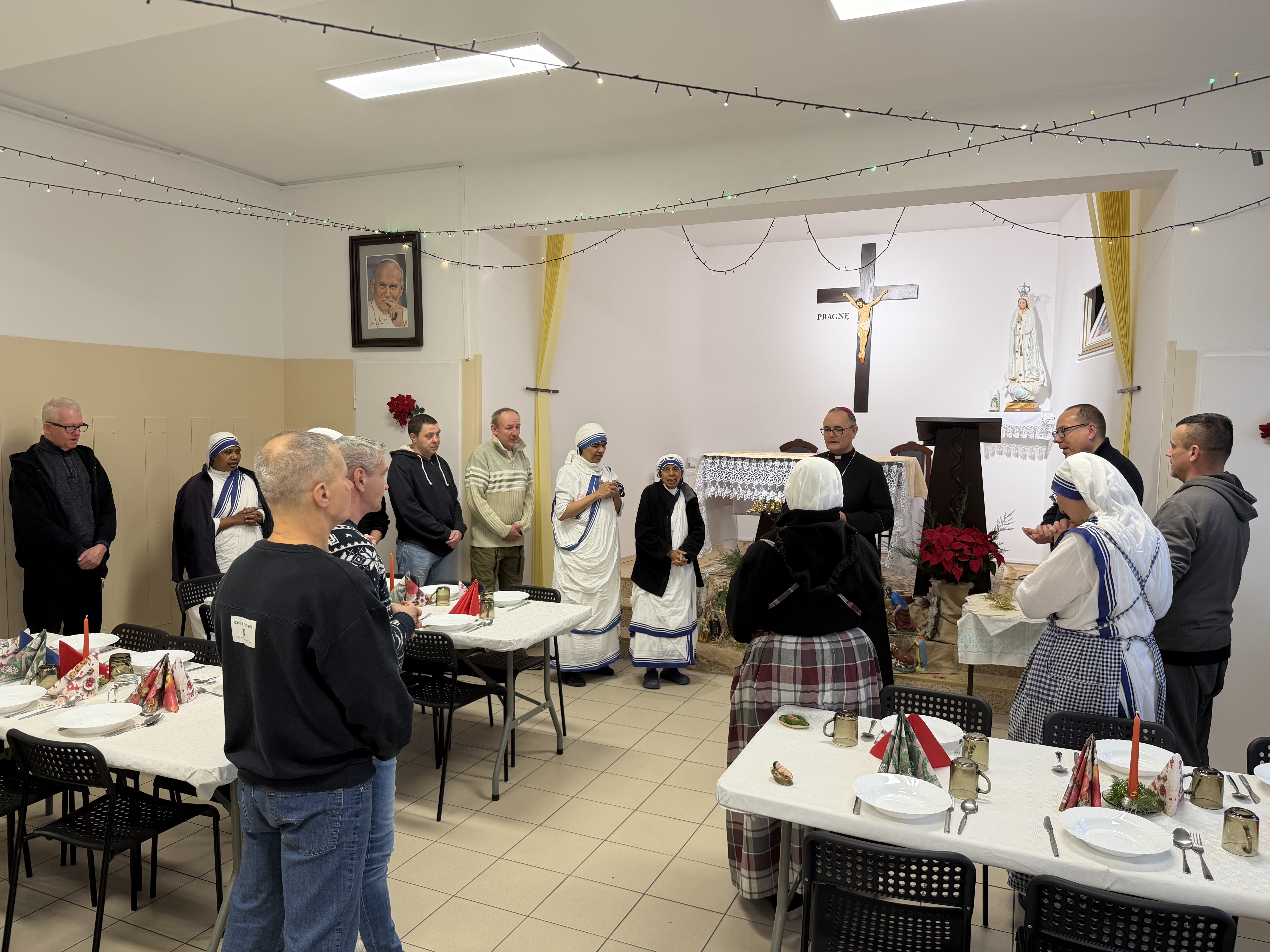 Kolejnym punktem wigilijnego dnia była wizyta u sióstr Misjonarek Miłości – sióstr kalkutek, które przygotowały Wigilię dla blisko 100 osób potrzebujących. Arcybiskup nie tylko złożył świąteczne życzenia, lecz także aktywnie włączył się w przygotowania, wspólnie z osobami bezdomnymi pomagając w organizacji sali oraz przygotowaniu wieczerzy wigilijnej.