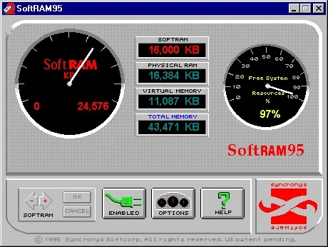 Tu właśnie okazję na rynkowy sukces upatrzyło Syncronys Softcorp ze swoim SoftRAM – „lekarstwem” na problemy ówczesnych komputerów. Za jedyne 29,95 dol. (lub 49,95 dol. w wersji dla Windows 95) SoftRAM miał natychmiast zwiększać dostępne zasoby. Wystarczyła jedna dyskietka i jeden klik.