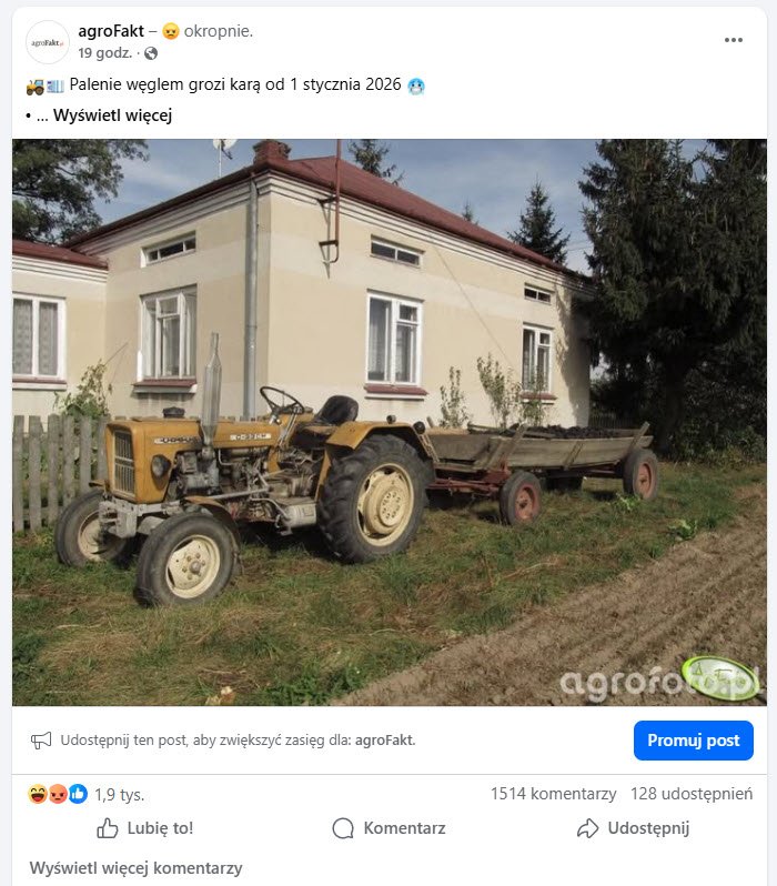 Temat ten wywołał ogromne poruszenie i wyraźną złość wśród rolników, co potwierdza milionowy zasięg wpisu i setki komentarzy w mediach społecznościowych. Niestety przepisy są nieubłagane – palenie węglem jest sukcesywnie zakazywane w kolejnych regionach Polski w ramach walki ze smogiem.