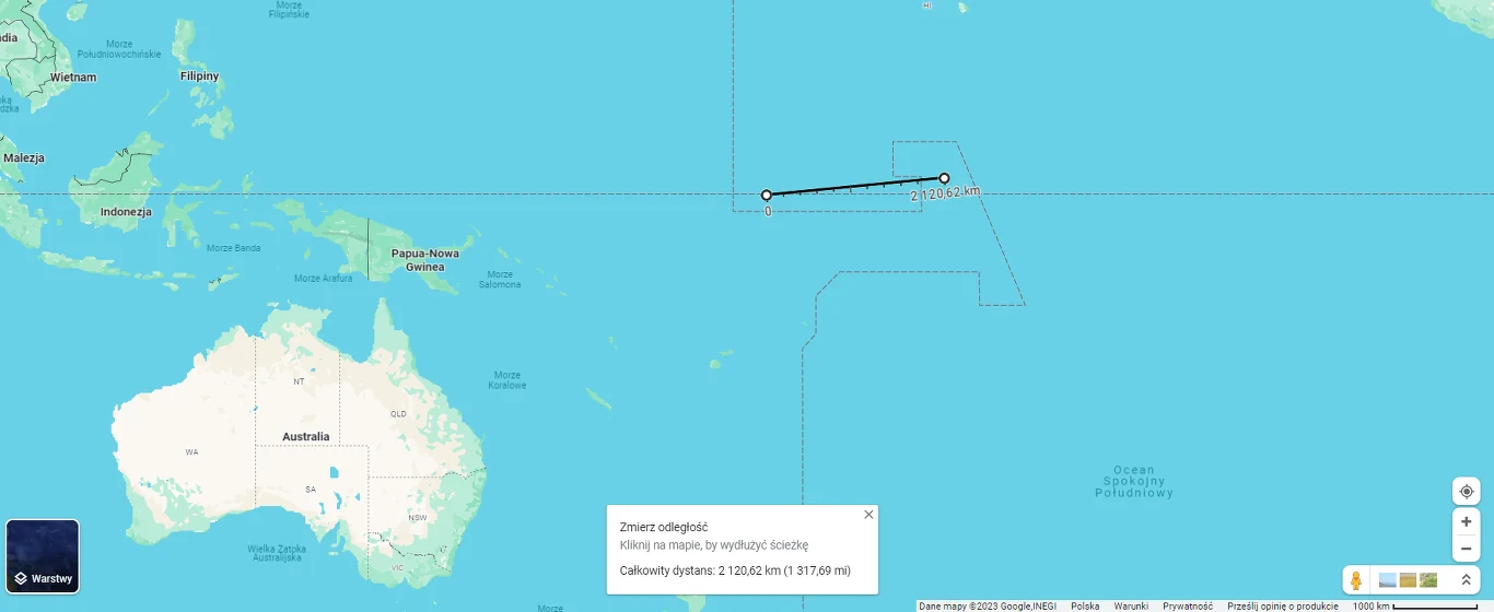 Odległość między wyspami Bakera i Kiribati wraz z zaznaczoną linią zmiany daty. Paradoksalnie na obszarach odległych o zaledwie 2000 km różnica czasu wynosi aż 24 godziny.Google Mapsmateriał zewnętrzny