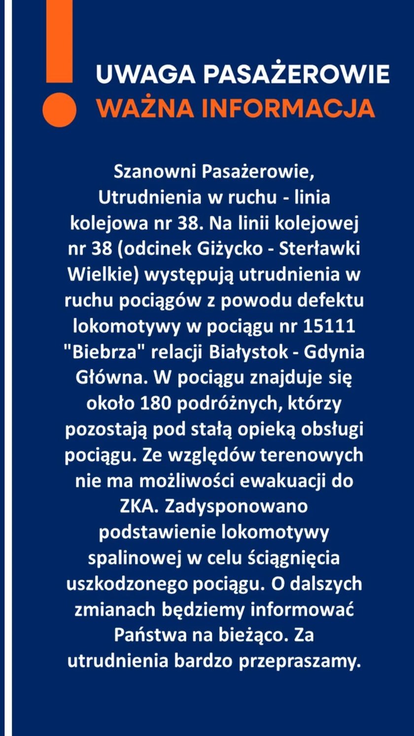 „Na linii kolejowej nr 38 (odcinek Giżycko — Sterławki Wielkie) występują utrudnienia w ruchu pociągów z powodu defektu lokomotywy w pociągu nr 15111 »Biebrza« relacji Białystok — Gdynia Główna. W pociągu znajduje się około 180 podróżnych, którzy pozostają pod stałą opieką obsługi pociągu. Ze względów terenowych nie ma możliwości ewakuacji do ZKA” — poinformowano.