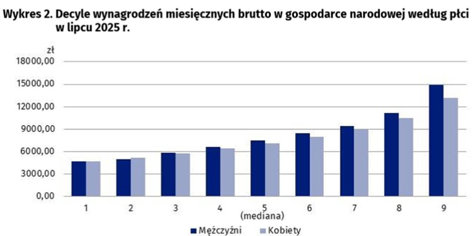 W lipcu 2025 r. 10 proc. najmniej zarabiających osób otrzymało wynagrodzenie co najwyżej w wysokości 4666 zł (decyl pierwszy). Z kolei 10 proc. najwięcej zarabiających otrzymało wynagrodzenie co najmniej w wysokości 14000 zł.