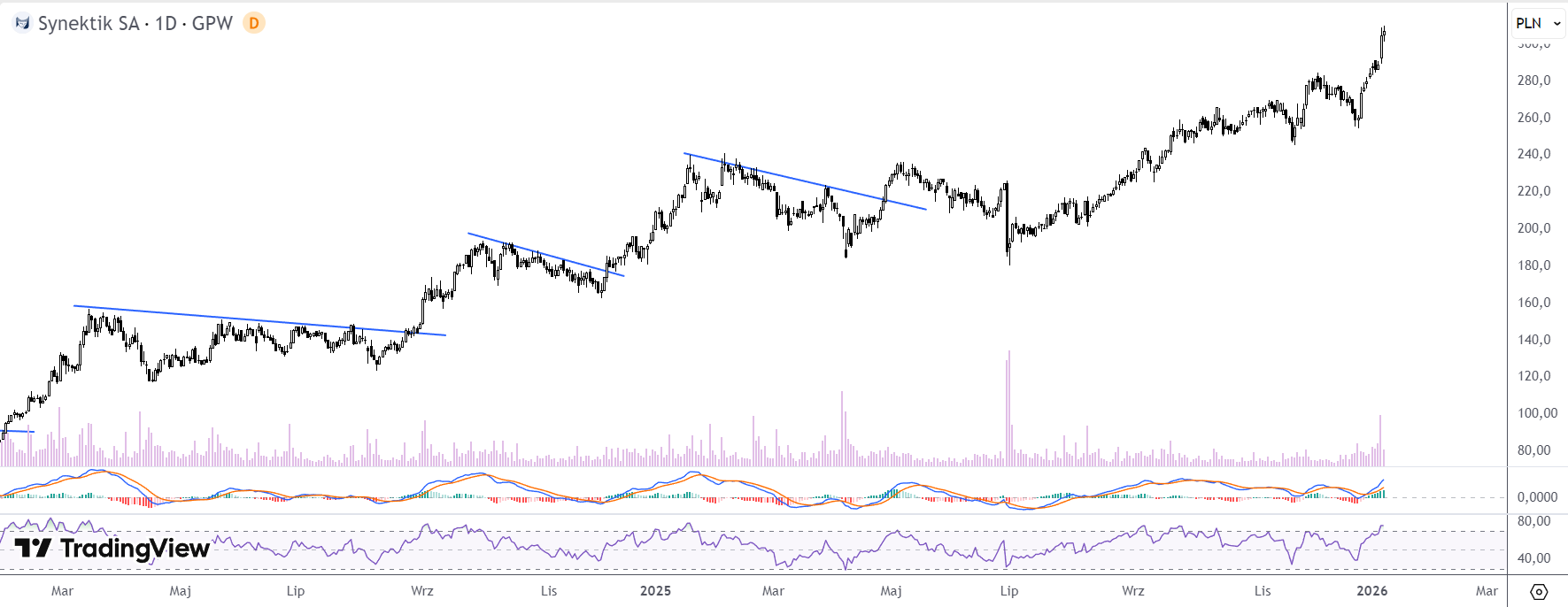 Niemal pionowy ruch w górę mamy na wykresie Synektik. Spółka cały czas rośnie, bardzo silnie na przełomie roku.