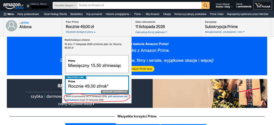 W nieco ukrytym linku znajduje się wiadomość o zmianach ceny za Amazon Prime ze wzmianką o tym, że dotyczy to także Prime Video. Jeśli chcemy kontynuować subskrypcję, powinniśmy zaakceptować informację przed datą kolejnej – wyższej – płatności, w przeciwnym razie dostęp do usługi wygaśnie.