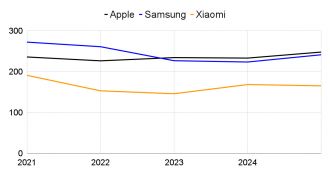 - Samsung – 241,2 mln (wzrost o 7,9 mln);