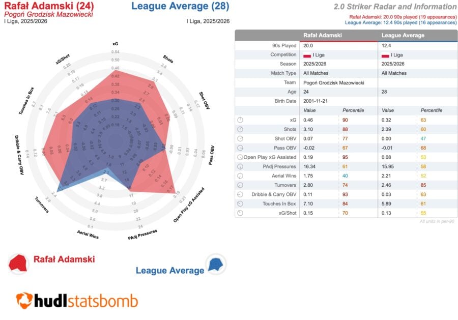 Do zestawienia Adamskiego z Rajoviciem od Hudl StatsBomb trzeba jednak podchodzić z pewnym dystansem. Jeden gra bowiem w Ekstraklasie, drugi tylko na jej zapleczu. Mimo to nie da się oprzeć wrażeniu, że piłkarz Pogoni jest zauważalnie innym typem napastnika – przede wszystkim wykazuje spore umiejętności w kreowaniu okazji kolegom i potrafi też sam zabrać się z akcją holując piłkę przy nodze. Ktoś powie, że to nie jest absolutnie napastnik w typie Marka Papszuna, ale to nie do końca prawda, o czym przekonuje mnie Michał Zachodny, pracujący przy meczach I ligi w TVP Sport: