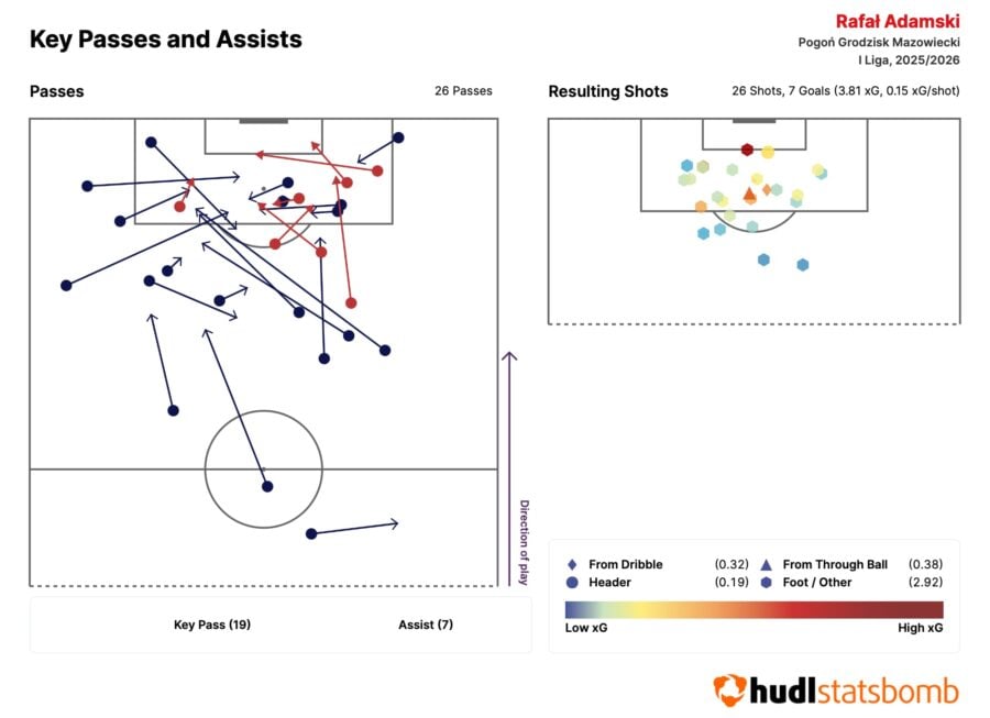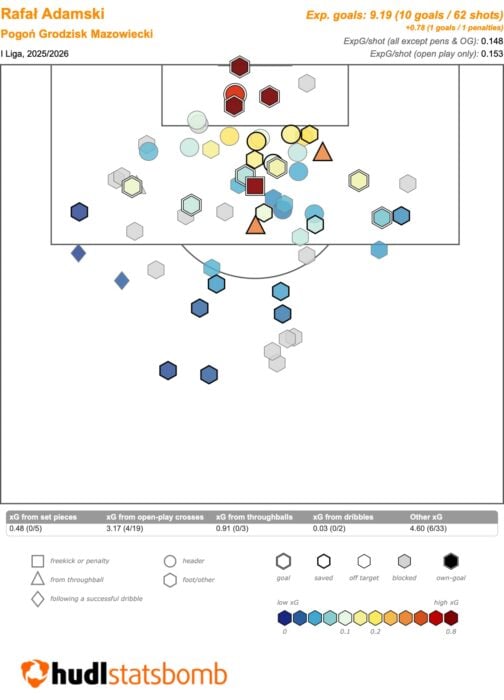 Przed zanurkowaniem w bardziej wymyślne statystyki rzućmy okiem na te podstawowe. One robią tak wielkie wrażenie, że lepiej złapcie się foteli – w dziewiętnastu ligowych meczach Rafał Adamski strzelił jedenaście goli i zanotował osiem asyst. W sumie jednak 21 z 37 bramek Pogoń zdobyła przy jego udziale, bo dwukrotnie „ostatnim podaniem” był w jego wypadku wywalczony rzut karny. Genialne liczby, po prostu genialne.