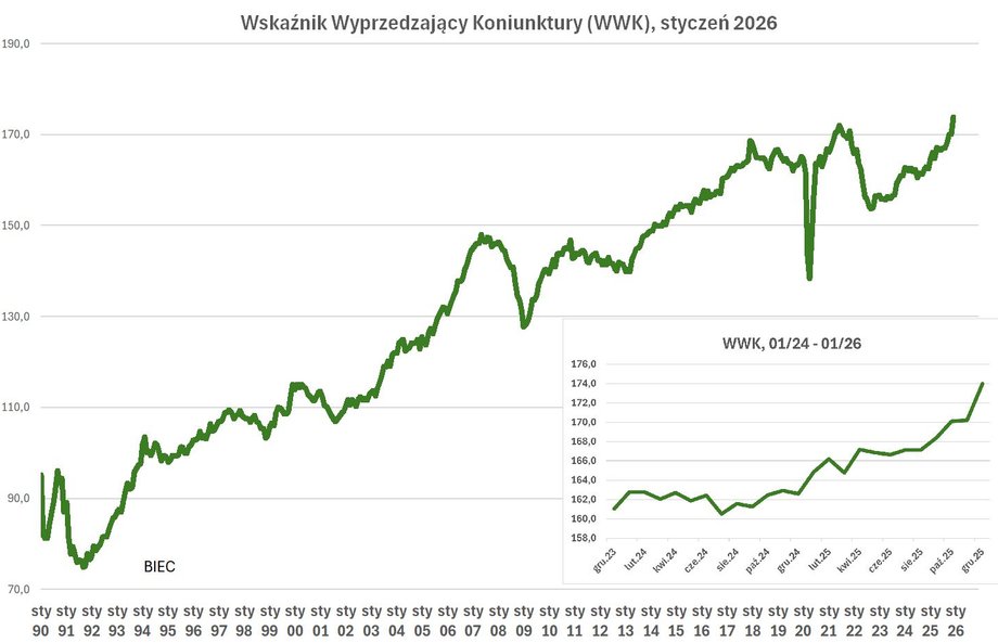 Wskaźnik Wyprzedzający Koniunktury, informujący z wyprzedzeniem o przyszłych tendencjach w gospodarce, w styczniu 2026 roku wzrósł o 3,8 pkt., do 174 pkt. — poinformowało Biuro Inwestycji i Cykli Ekonomicznych. W listopadzie wskaźnik miał wartość 170,2 pkt. Jak napisali autorzy raportu BIEC, ten silny wzrost wynika głównie z poprawy ocen ogólnych perspektyw rozwojowych gospodarki oraz własnej firmy.
