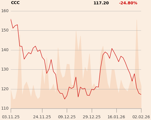 Na zamknięciu sesji w piątek kurs CCC wyniósł 117,8 zł. W dwie sesje spadł o 8 proc. po tym, jak spółka znów obniżyła prognozę wyników po gorszych od oczekiwań rezultatach za IV kwartał.W roku obrotowym 2025 (skończył się w styczniu) firma spodziewa się 10,9 mld zł przychodów (wobec 10,5 mld zł w 2024 r.) i 1,43–1,47 mld zł EBITDA (wobec 1,7 mld zł w 2024 r.).