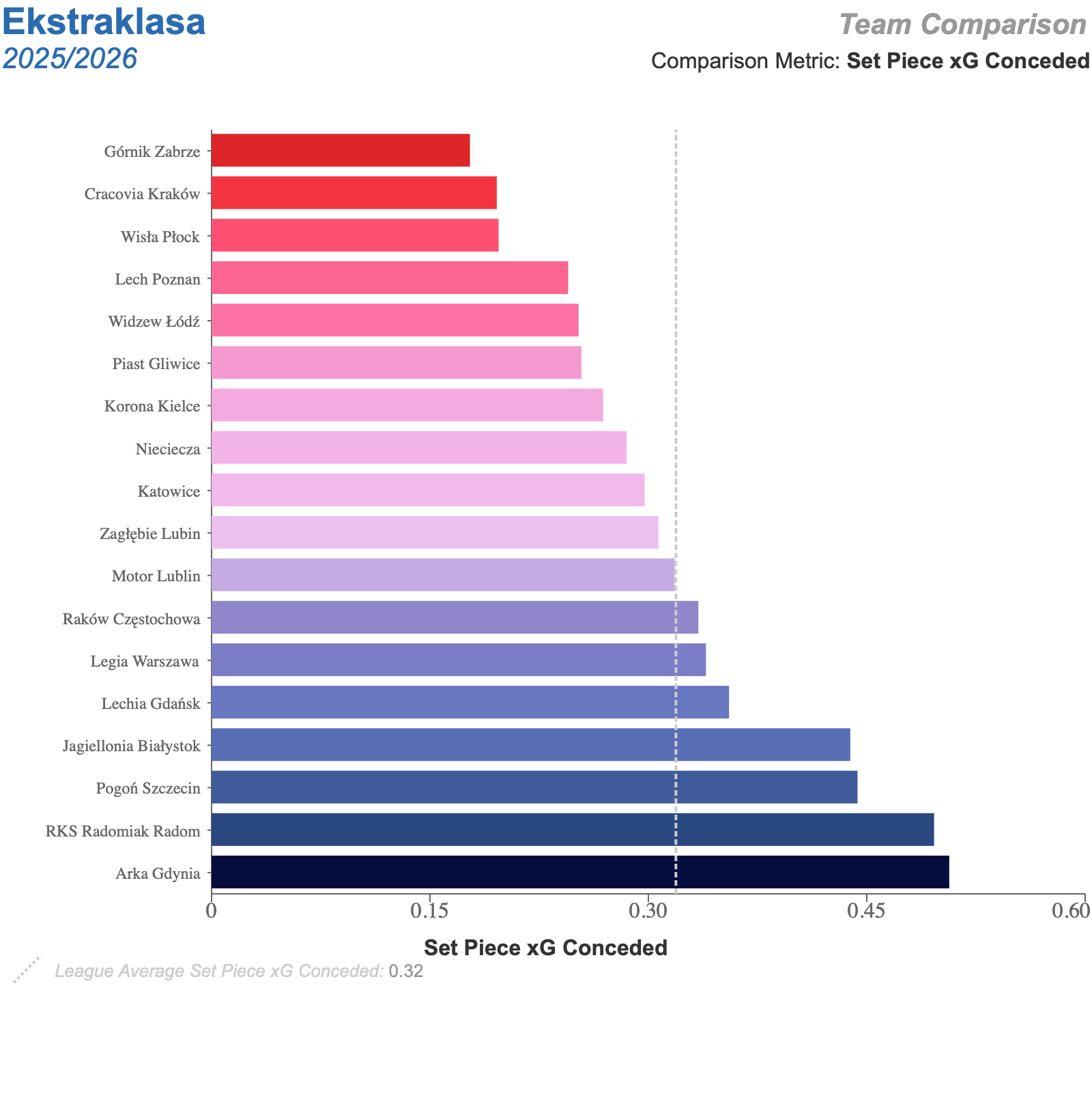 xG rywali po stałych fragmentach gry w Ekstraklasie – Hudl StatsBomb