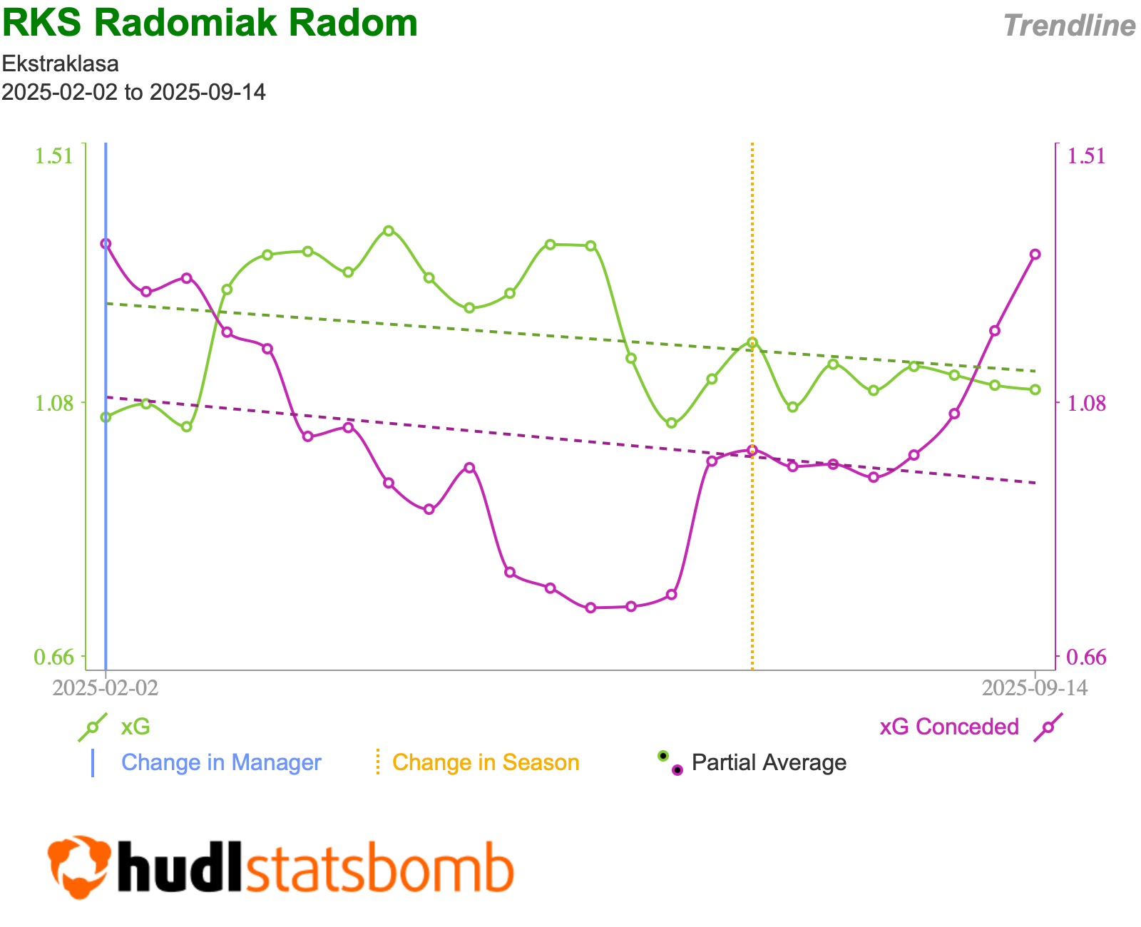 Fraza o „nieczęstych na tym poziomie błędach” jest o tyle błędna, że Radomiak i pomyłki w defensywie to w zasadzie synonim. Joao Henriques w Portugalii uchodzi za speca od organizacji gry w obronie, tymczasem ostatni raz czyste konto przytrafiło mu się w maju. Nie wszystko wynika jednak z braku wspomnianej organizacji. Zerknijmy na liczby z platformy Hudl StatsBomb: