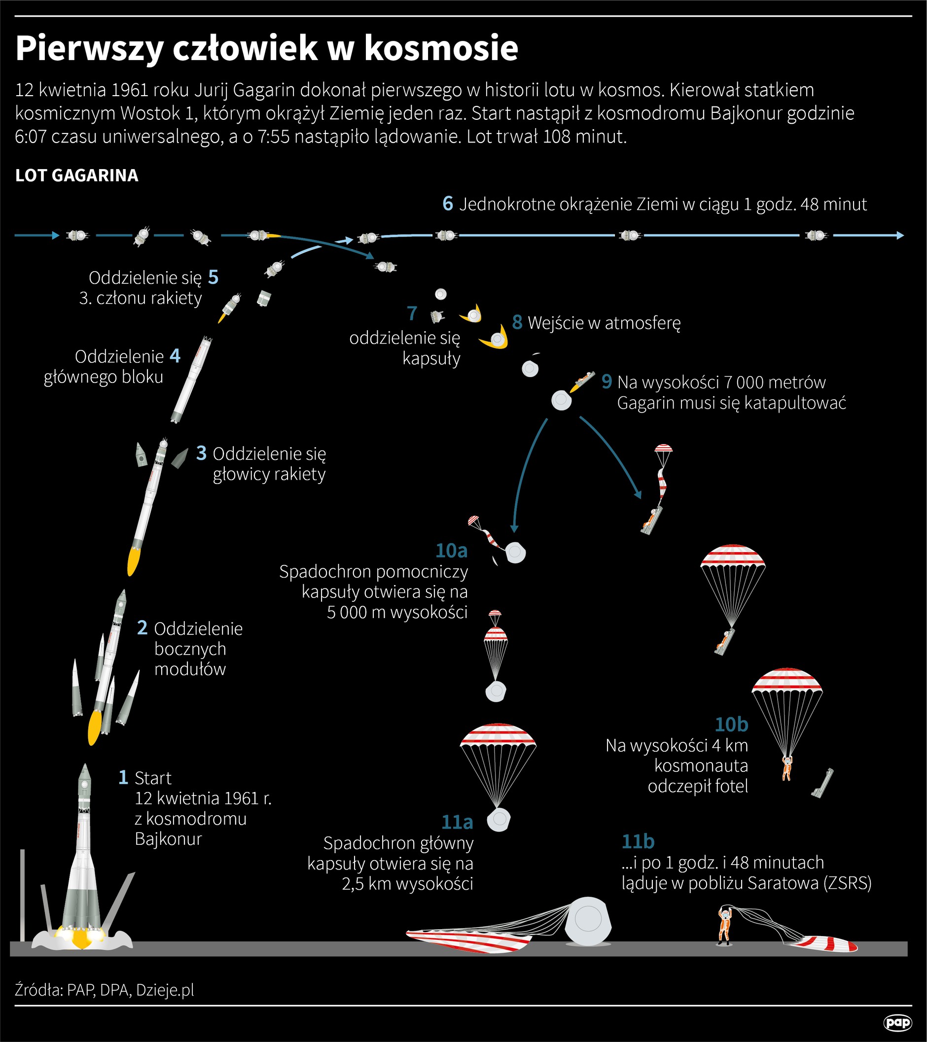 Jedna iskra w urządzeniach umieszczonych wewnątrz komór spalania rakiety R-7 i w środę 12 kwietnia 1961 r., gdy w Moskwie była godz. 9.07, Jurij Aleksiejewicz Gagarin został wystrzelony w niebo. I jeszcze dalej.