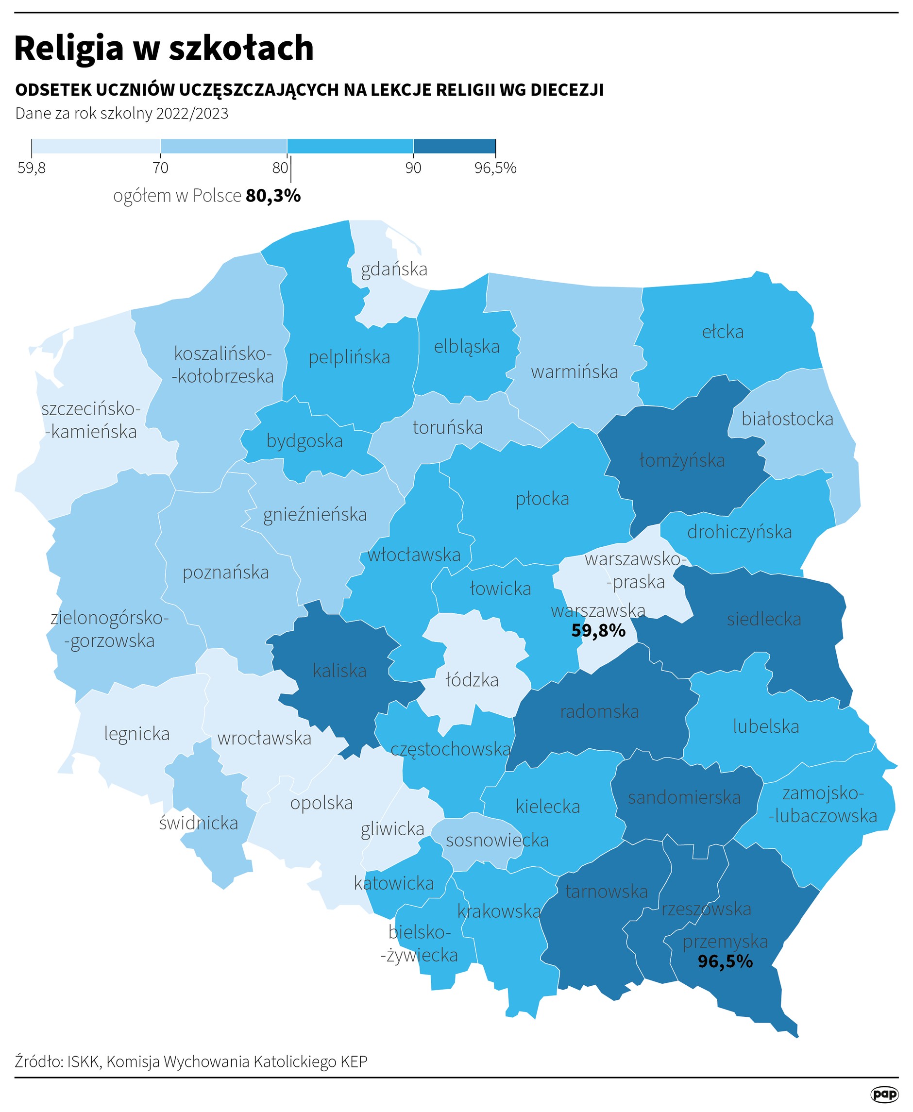 — Zróżnicowanie geograficzne odpływu uczniów i uczennic z lekcji religii nie jest niczym zaskakującym. Od zawsze polska religijność była pod tym względem zróżnicowana. I nawet w czasach, kiedy wszędzie dużo osób uczęszczało na religię czy niedzielne msze, poszczególne regiony różniły się między sobą. Od zawsze odnotowywano mniej praktykujących w województwach zachodnich i więcej na wschodzie kraju, np. na Podlasiu czy Podkarpaciu. Drugą różnicą jest częstotliwość wypisywania się z religii w mniejszych miejscowościach i na terenach wiejskich oraz w dużych miastach. Największa dynamika jest w dużych ośrodkach miejskich i tradycyjnie najmniej religijnych miejscach Polski, ale zjawisko wypisywania się uczniów z lekcji religii widać wszędzie — wyjaśnia Ignacy Dudkiewicz.