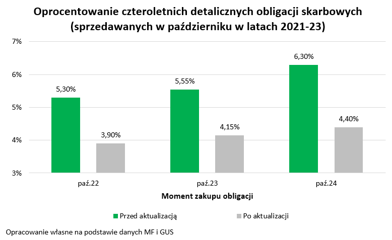 Tylko w pierwszym roku od zakupu oprocentowanie tych obligacji jest stałe. Potem odsetki zależą od inflacji. W efekcie, jeśli akurat w październiku wypadał nam moment aktualizacji oprocentowania, to Minister Finansów weźmie pod uwagę najnowszy odczyt inflacji opublikowany przez GUS. Najnowsze kompletne dane, które były dostępne na początku października, podsumowywały zmiany cen w sierpniu. Wtedy, jak wyliczył urząd, roczny wskaźnik inflacji CPI wyniósł 2,9%. Musimy jeszcze wiedzieć, że popularna wśród rodaków czteroletnia detaliczna obligacja skarbowa emitowana w październiku 2022 roku kusiła inwestorów marżą zysku na poziomie 1 pkt. proc. W efekcie sumując marżę i sierpniową inflację otrzymujemy wynik na poziomie 3,9%. Jak na papier czteroletni nie są to warunki zwalające z nóg.