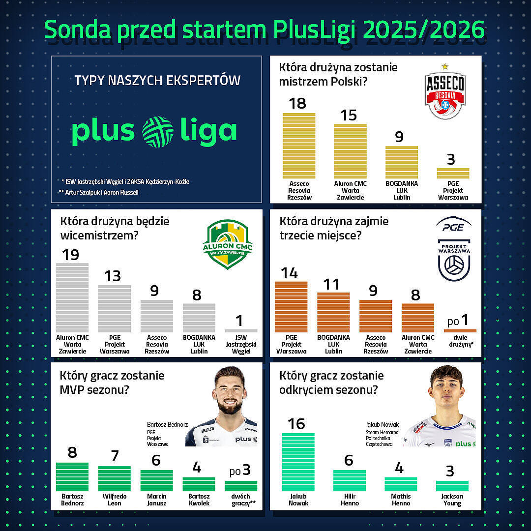 Zapytaliśmy dziennikarzy, trenerów, siatkarskich ekspertów o to, kto będzie w maju 2026 roku świętować zdobycie medali PlusLigi sezonu 2025, którzy gracze oczarują nas swoją postawą? Oto wyniki naszej sondy i typy ekspertów.