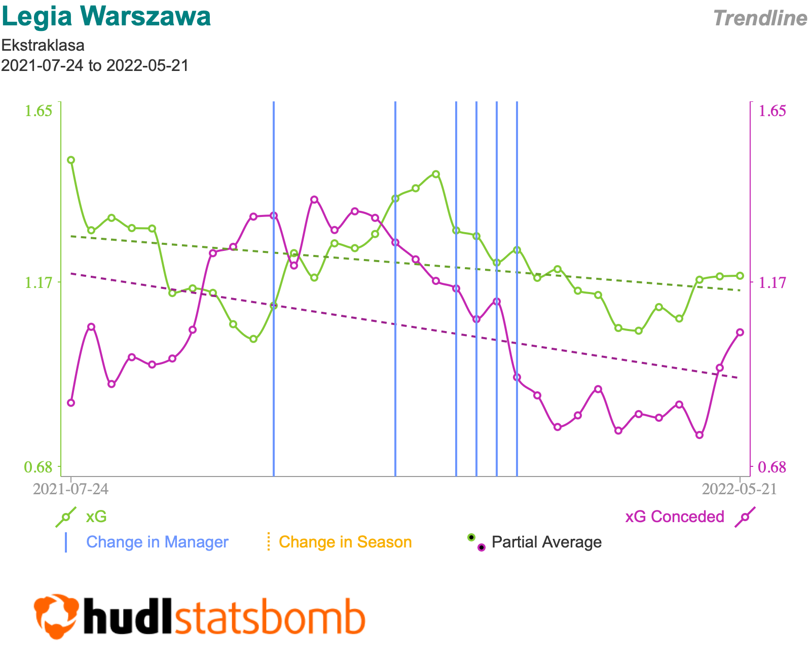 Okres pracy Aleksandara Vukovicia od drugiej niebieskiej kreski – Hudl StatsBomb trochę się pogubił, dodając kolejne.