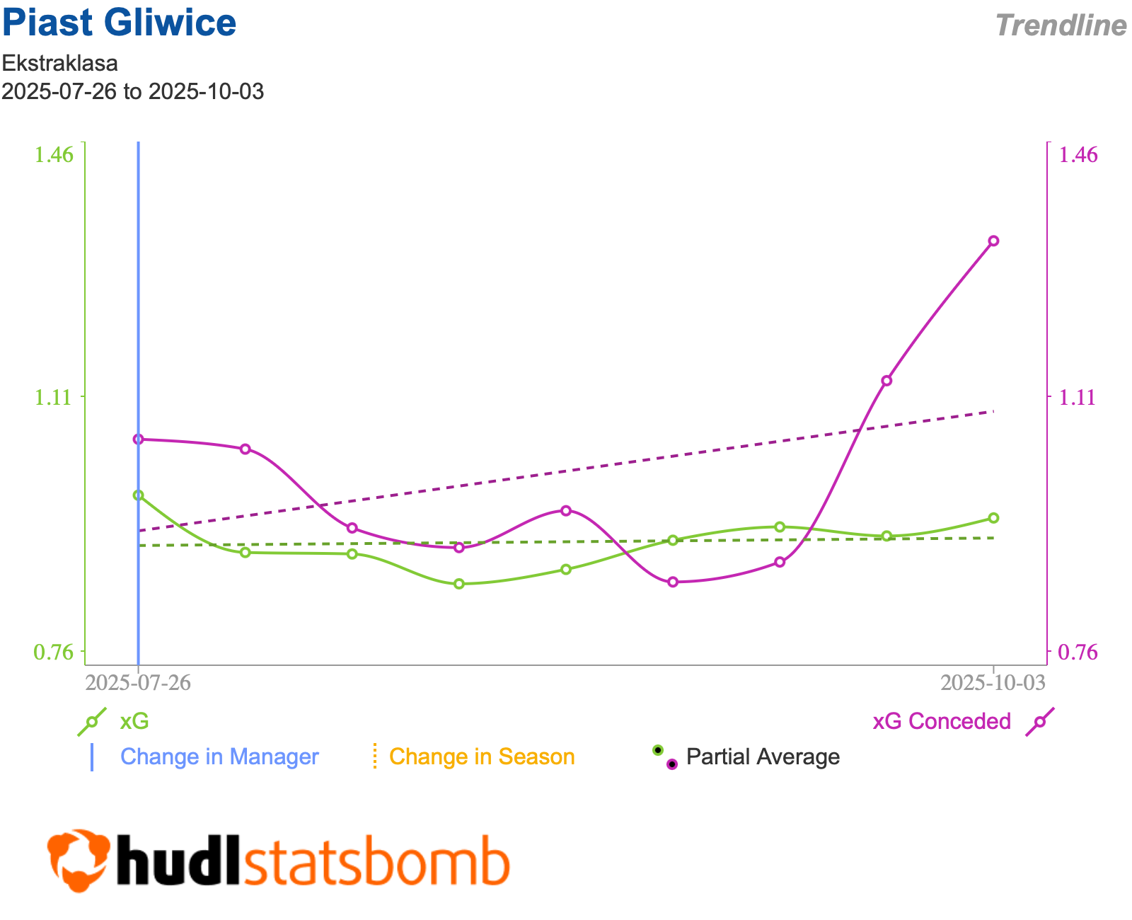 Wykres xG i xGA Piasta Gliwice w tym sezonie. Widać, że gra w obronie wygląda coraz gorzej.