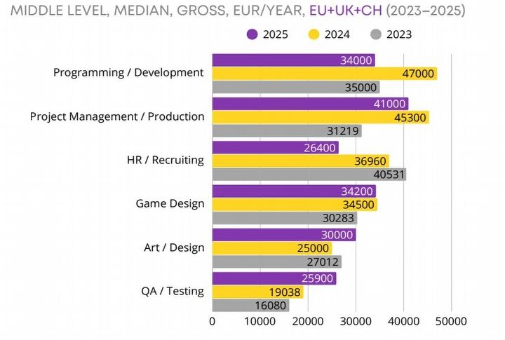 Zmiany w zarobkach w latach 2023-2025 w różnych sektorach gamedevu.GameIndustry.biz / InGame Job / Values Value