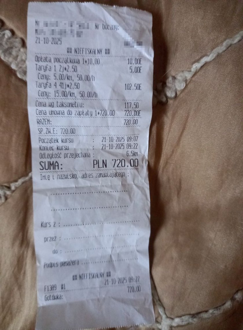 Z paragonu wynika też, że „przewoźnik” mógł być też taksówkarzem. Włączył bowiem taksometr. W dodatku po godz. 9 rano, w dzień powszedni, zastosował taryfę 4, czyli nocną, stosowaną poza granicami miasta. Według taksometru wyszło nieco ponad 117 zł, ale ten kierowca zastosował „cenę umowną” , czyli 720 zł.