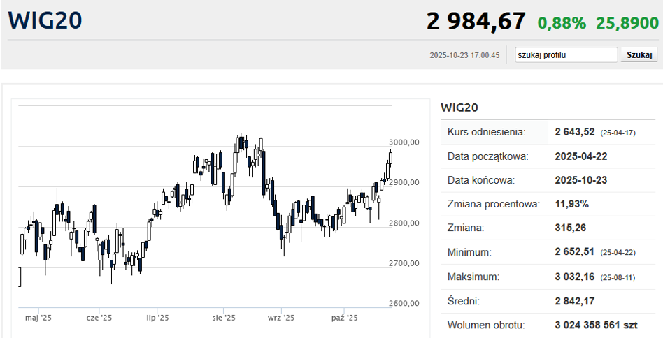 Po zwyżce o 0,88% WIG20 dotarł na wysokość 2 984,67 punktów. To najwyższy kurs zamknięcia od 21 sierpnia, a więc przeszło dwóch
