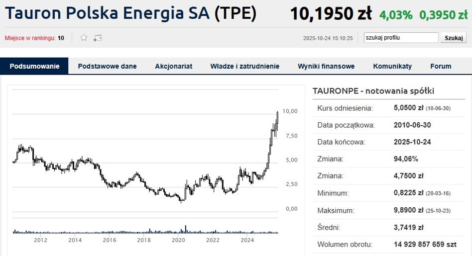 Cytowany w komunikacie prezes Tauron Polska Energia Grzegorz Lot zwrócił uwagę, że przekroczenie poziomu 10 zł za akcję oznacza ponad 160-procentowy wzrost od początku roku, kiedy kurs akcji kształtował się na poziomie 3,80 zł. Od czasu rozpoczęcia pracy obecnego zarządu – od marca 2024 r. – wzrost kursu akcji wyniósł już 230 proc., za czym w opinii prezesa stoi „zaangażowanie i konsekwentna realizacja założeń, zaprezentowanej pod koniec ubiegłego roku strategii”.
