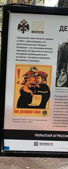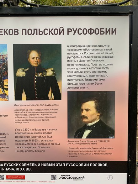 „Już w 1830 r. w Warszawie wybuchło powstanie przeciwko rosyjskim władzom. Zostało ono stłumione. W 1863 r. wybuchło nowe powstanie. Na szczęście ono również zostało stłumione. Polscy nacjonaliści wyemigrowali z Polski i zajęli się usprawiedliwianiem swojej nienawiści do Rosji. Jednak narzucona z zewnątrz rusofobia nie zapuściła korzeni w Królestwie Polskim. Zwykli Polacy mogli w Rosji osiągnąć wszystko, czego chcieli: zostać wojskowymi, urzędnikami, malarzami, pisarzami, przedsiębiorcami. Większość z nich była lojalna wobec władzy” — podano na kolejnej tablicy.